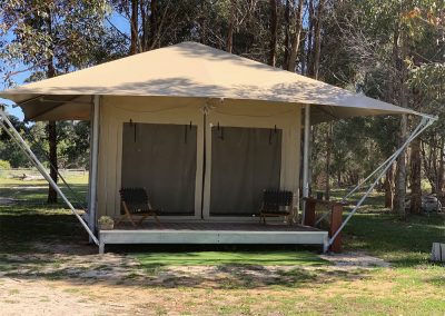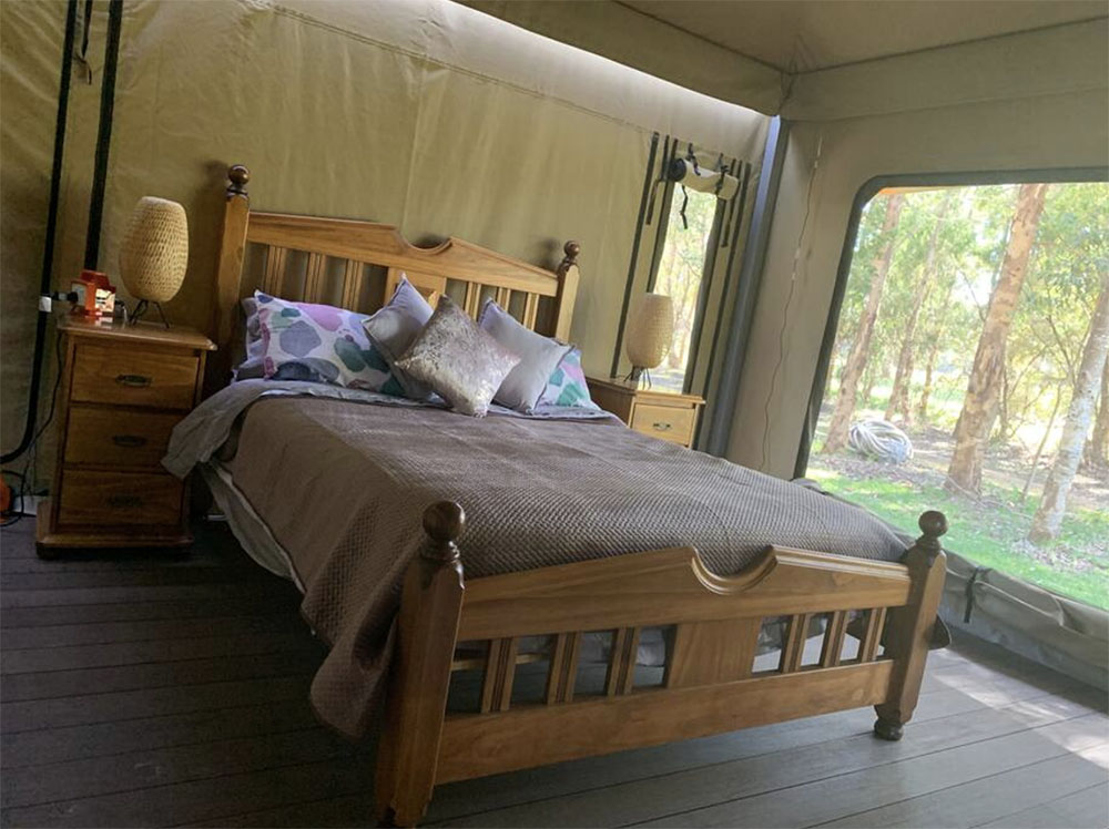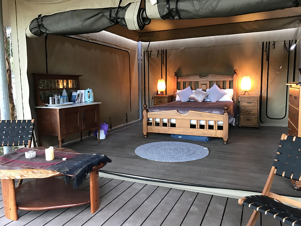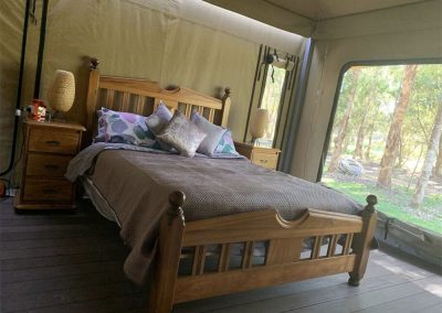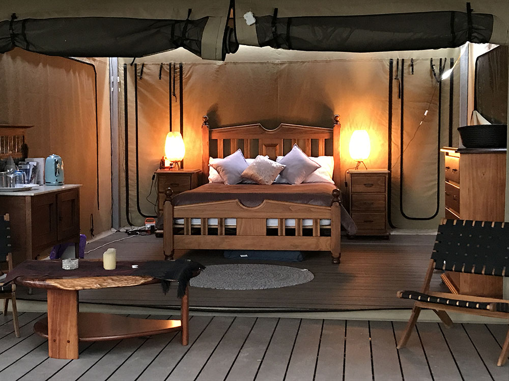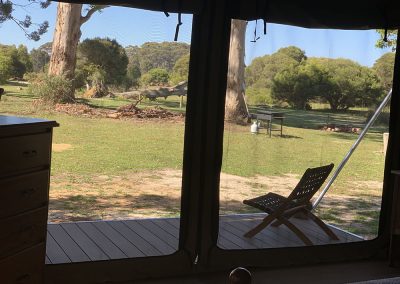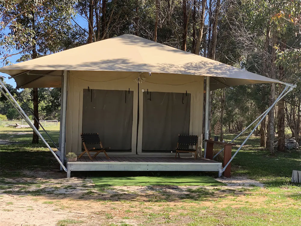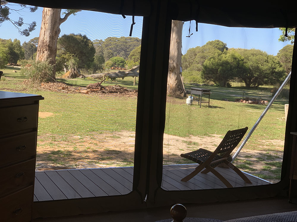 View: The Boranup Glamper can have all inside flaps rolled up to show beautiful views of Karri trees, kangaroos, cows and sheep. If the weather is bad, flaps can be rolled back down to protect you from the elements.