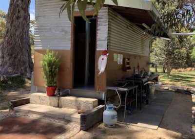 Amenities: Campers kitchen, shared space with other campers, has a microwave, toaster, toasty maker, bbq, hot plate, 2 sinks, some crockery, some cutlery, some pots and pans. There is also a small bar fridge. Anything extra is to be supplied by the campers. There is also a shared  Linen is provided, there is a queen bed, a chest of draws, bedside tables and a small table with tea/coffee making facilities. There is power in the glamper. There are 2 inside lamps and snake lights inside.
